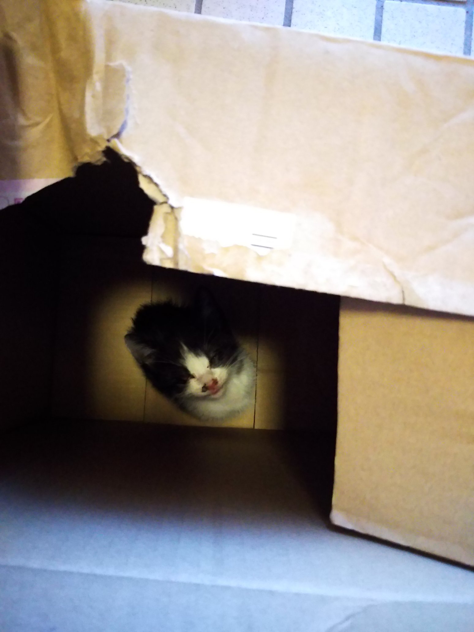 眼の腫れが少しずつ引いてきたのか、瞬膜の癒着が三分の一ほど剥がれ、視界がちょっと良くなった仔猫はお部屋の探検を始めました。隙間という隙間に嵌りだす。