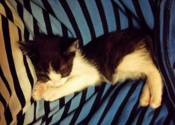 ダッシュで病院に駆け込み、診断と処方を受けると、1か月すぎの月齢にしては小さすぎる痩せすぎ猫とのこと。瞬膜(ねこってそんなのが身体にあるんスね)(無知)がなんかで傷つき化膿&癒着しちゃってて目が見えてないっぽいこと。薄汚れっぷりからして、親猫とはぐれて数日経ってそうとのこと。風邪もひいてて鼻も利いてないとのこと。ガリなのにお腹だけ膨れてるから虫いそうだねとのこと。いろいろなことがわかりました。