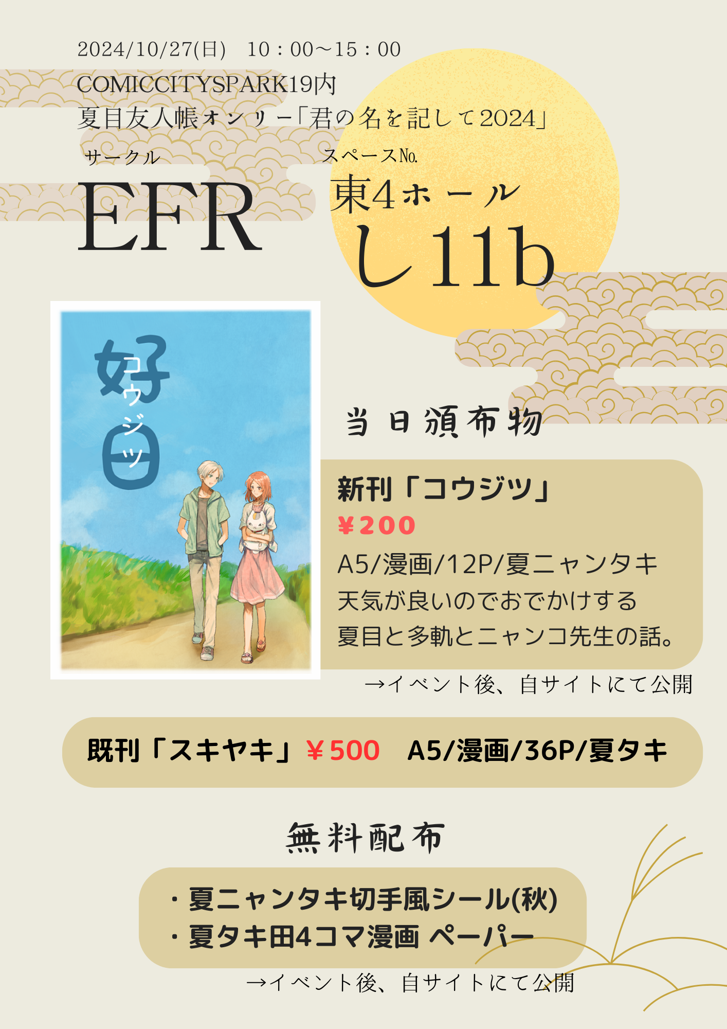 スペースは【全年齢Aき3】です。夏目友人帳(多軌透中心)で申し込みました。
